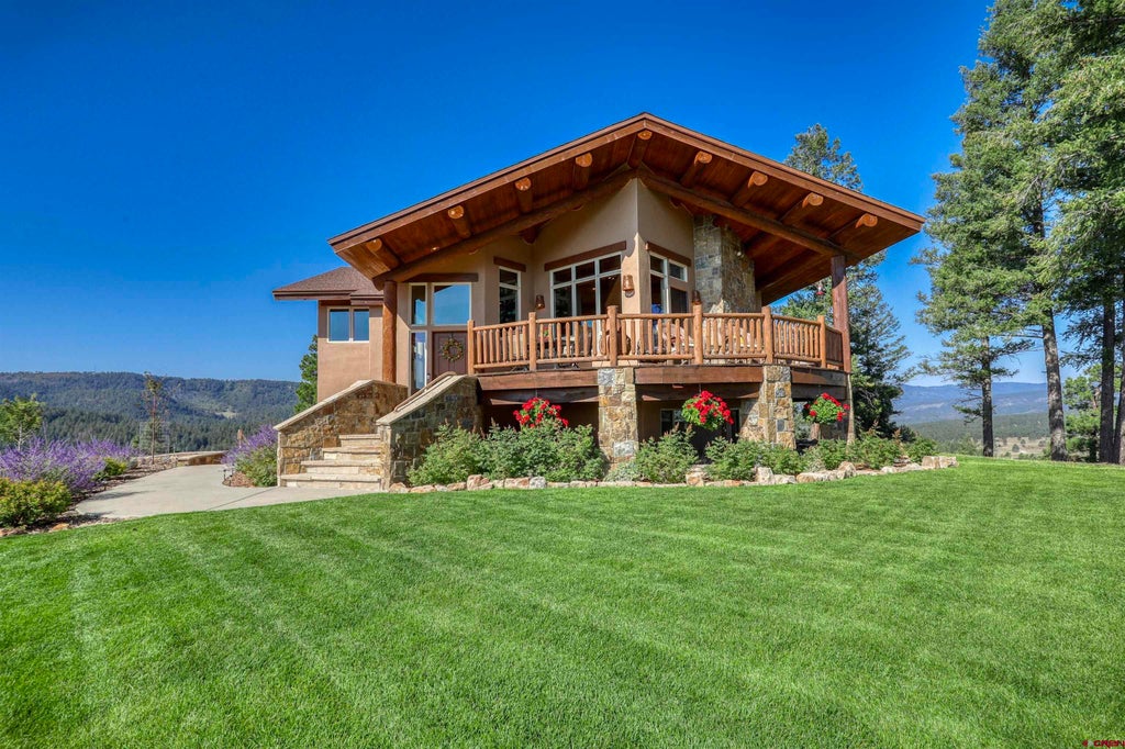 Beautiful Custom Home on 23.5 Acres with exceptional San Juan Mountain Views Nestled on 23.5 acres of pristine land, this exquisite home offers unparalleled privacy and breathtaking 360-degree panoramic views. The spacious 3,061-square-foot layout features 3 bedrooms, 3 bathrooms, an office, and a flexible den/family room, all "turn key" ready—fully furnished for immediate move-in. The main floor boasts an expansive Great Room with real rock gas log fireplace, open full round log beams and a luxurious primary Suite, including private balcony with mtn views. The newly remodeled gourmet kitchen comes equipped with granite countertops and stainless steel appliances, with a brand-new refrigerator and dishwasher arriving in September 2024. Step outside to enjoy three expansive decks, a beautifully newly landscaped yard, and a relaxing hot tub, perfect for soaking in the natural beauty that surrounds the home. Additional features include an oversized two-car garage for ample storage, newly painted and stained exterior, all new exterior rockwork, and the recent addition of central air conditioning. This home is a rare gem—offering both luxury and seclusion. Schedule your viewing today!